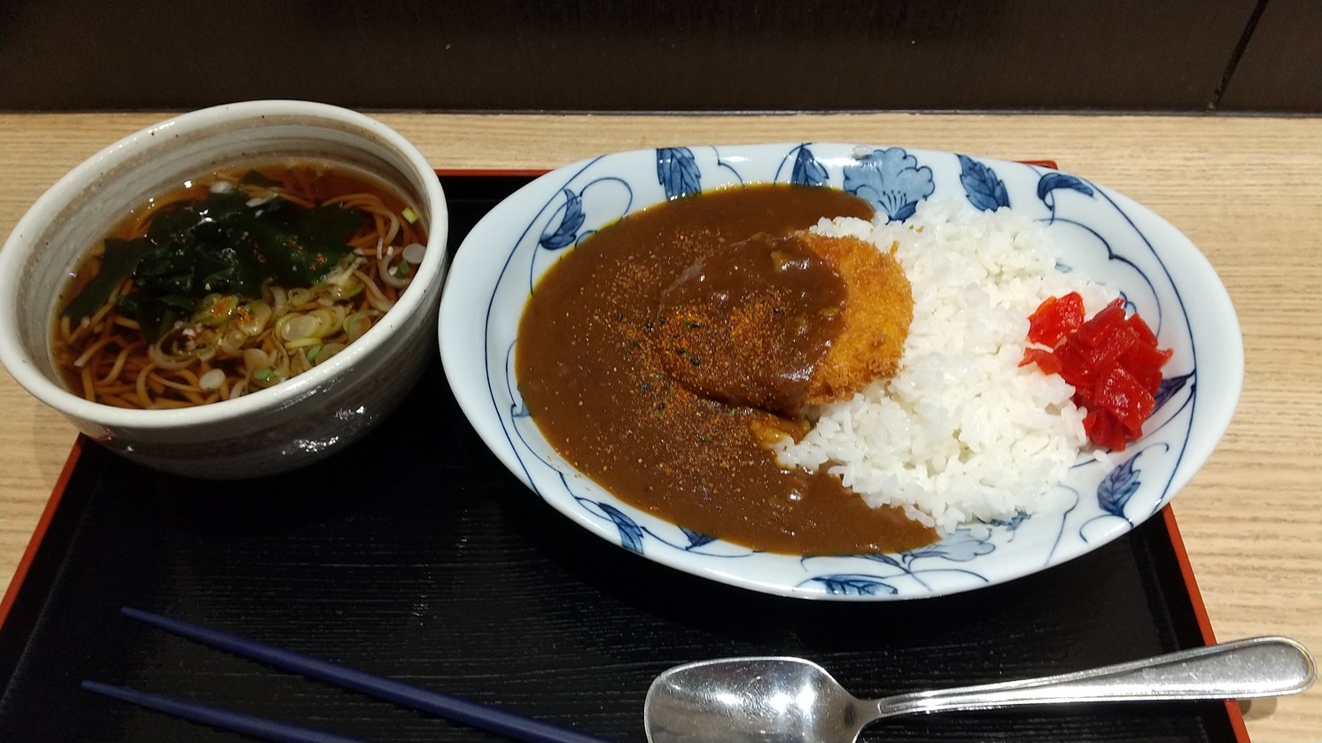 昼は秋田駅の駅蕎麦「白神そば」で蕎麦とコロッケカレーのセット。